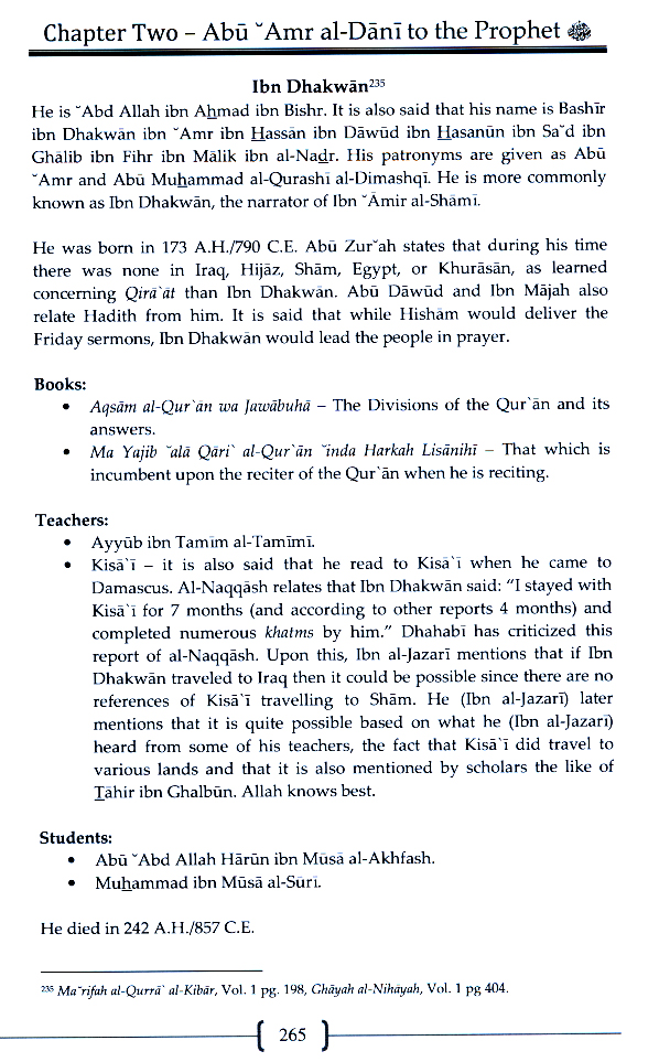 One of the means of safeguarding the Quran from any distortions has been selecting unique individuals from the nation of Islam who have dedicated their lives in memorising the Quran; perfecting its recitation; and training others to become experts in these skills. The Quran was revealed verbally; and in this manner it was taught by the Prophet to his Companions; and by them to the Successors; and so on. This continuous and uninterrupted chain of Quranic scholars have continued in every generation from the Prophetic period until present-day; preserving both the text and every minutiae of its pronunciation. This book presents biographies of many contemporary scholars of Quran; from Egypt; Syria; India and Pakistan. It studies their transmission chains (sanads) and how the oral transmission of the Quran has continued for more than 1400 years so that it has reached us in the same pure and pristine form that it was revealed in. It includes a chapter dedicated to local Quran teachers and students in the Western Cape. It mentions everyone in Cape Town who has sanad and ijazah; their teachers; as well as what they have received sanad and ijazah in.