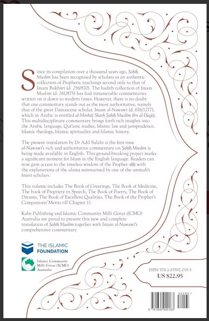 Imam Nawawi's commentary on Sahih Muslim is one of the mosthighly regarded works in Islamic thought and literature. Accepted by everySunni school of thought and foundational in the Shaafi school, this text,available for the first time in English, is famed throughout the Muslim world.After the Qur'an, the prophetic traditions are the most recognised source ofwisdom in Islam. Amongst the collected Hadith, Sahih Muslim is second only tothe collection of Imam Bukhari. With a commentary by Imam Nawawi, whose otherworks are amongst the most widely-read books on Islam, and translated by AdilSalahi, a modern scholar of great acclaim, this immense work, finally availableto English readers, is an essential addition to every Muslim library, and foranybody with an interest in Islamic thought.