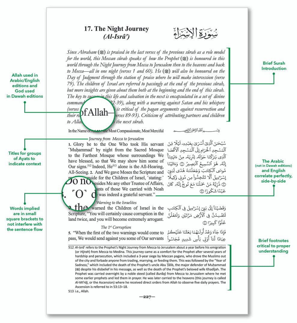 English text in 16-Point font helpful for those with low vision, visual impairments (such as macular degeneration or cataracts), or reading disabilities Breaks the English into "thematic" paragraphs, to help keep along in interpretation Features the contemporary Mustafa Khattab English translation, considered amongst the most effective in understanding