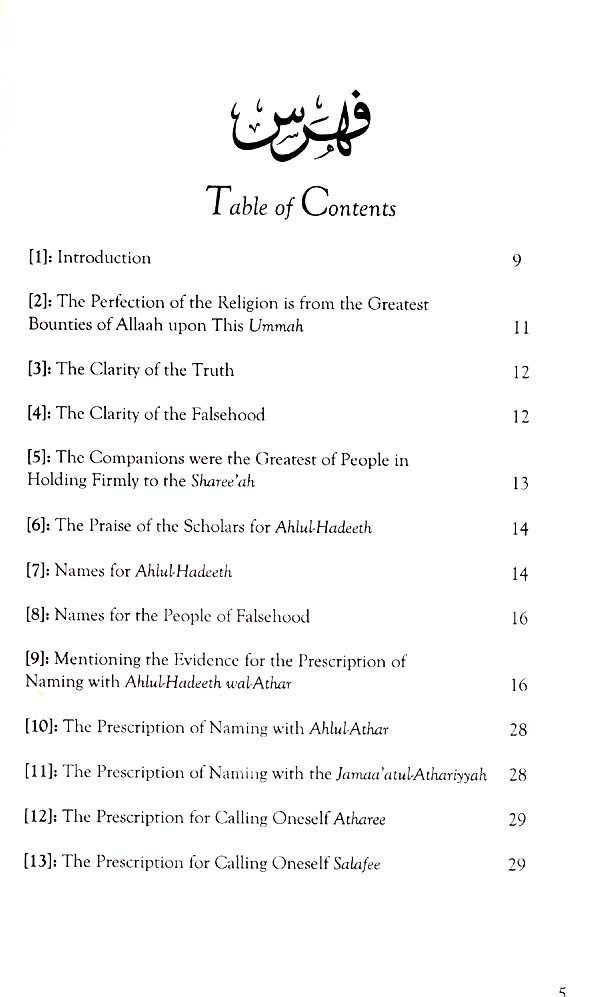 The topics covered in the book include: The perfection of the ShareeÆah, the clarity of truth, the various names of the people of hadeeth, the legislation of naming with Ahlul-Athar, Atharee, Salafee, mentioning the signs of the people of innovation, the proof that the history of the Ahlul-Hadeeth begins from the time of the Companions to this day of ours, the virtues of seeking hadeeth, AllahÆs benevolence upon the people of hadeeth with the isnaad, the people of hadeeth are the saved sect and aided group, the Four Imaams are from amongst the Ahlul-Hadeeth, the innovators hate the Ahlul-Hadeeth, the Ahlul-Hadeeth are the actual callers to Allaah, the Ahlul-Hadeeth are always the best of all people in all times, the Ahlul-Hadeeth are the people of unity and much moreà