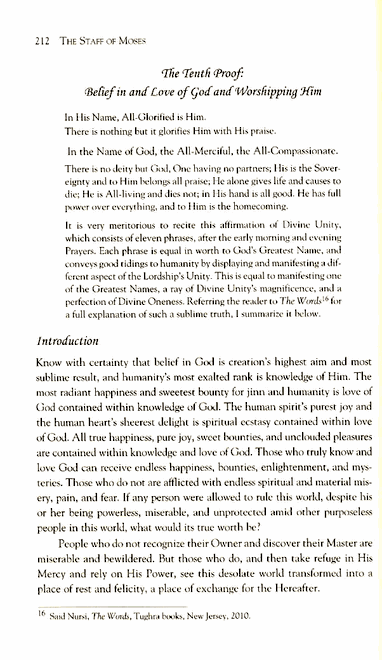 This book consists of two parts. First is 'fruits of belief' and the second part is 'a decisive proof of God.' Fruits of Belief’ is about dispelling the darkness of too much worldly goods used to put today's man in a state of neglect and giving light to the future by means of awakening heart and mind. In the author's words: "just as the staff of Prophet Moses caused twelve springs to gush forth and was the means of eleven miracles, so the present collection (The Staff of Moses) consists of the eleven light-scattering topics of 'The Fruits of Belief,' and the eleven certain proofs of 'The Decisive Proof (of God),' " thus, this book receives it's name The Staff of Moses, and a source for life-giving waters for strengthening one's faith.