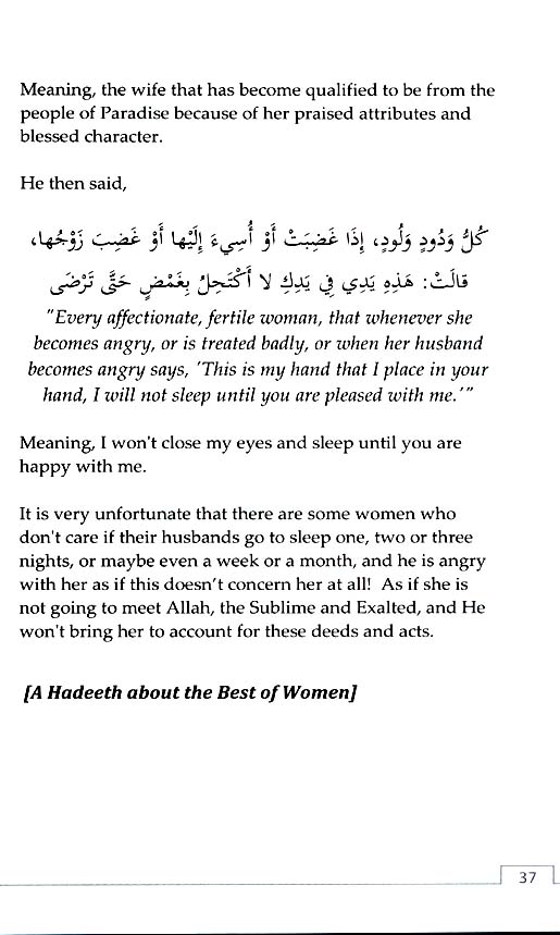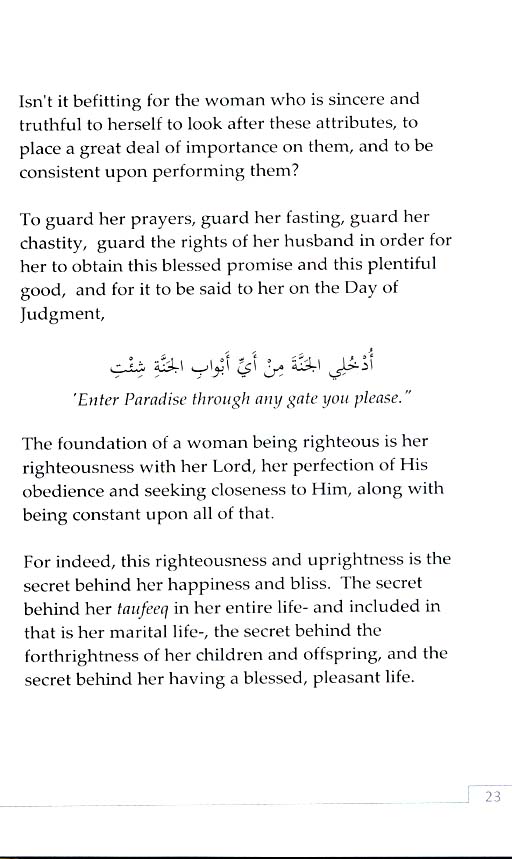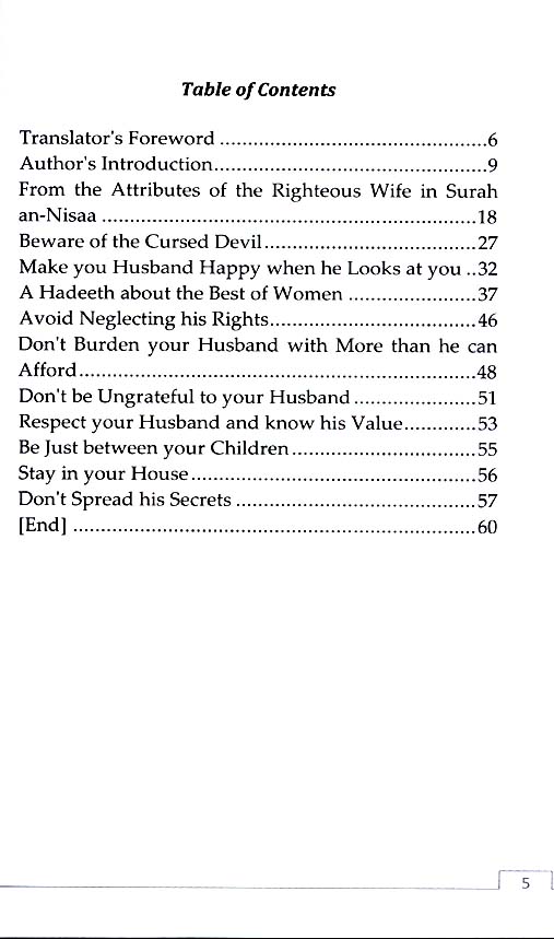 The author says, "The topic of this book, "The Attributes of the Righteous Wife", isn't just for the young woman looking forward to marriage and wants to know about the attributes of a good wife in order to adorn herself with those attributes and prepare herself to implement and perfect them. Nor is it merely addressed to the married woman who has already chosen these righteous attributes and wishes to persevere and continue to practice them. Nor is it only for the married woman who fails to fulfill these attributes and falls short in them in order for her to fix herself and rectify her marital life. Rather it is an address and a reminder much more general than all of this. It is a reminder for the father who wants his daughters as well as any other women under his guardianship to have a good upbringing, an honorable life and an entrance into marital life according to what Allah and His Messenger have intended. This treatise will hopefully aid him in reminding these young women of the legislative guidelines and necessary characteristics that the young Muslim woman must be cultivated upon and look after. This treatise is also a reminder for the mother who is the shepherd of her home, the one responsible for her daughters as their instructor, for surely most women grow up practicing that which they saw and heard their mothers doing. It is also a reminder for the callers to Allah to look after this affair, to place importance on this matter and to strive very hard in spreading these virtuous attributes, commendable characteristics and blessed traits...."