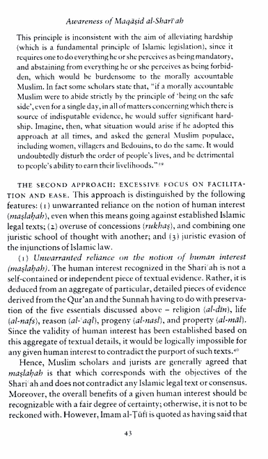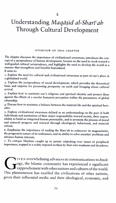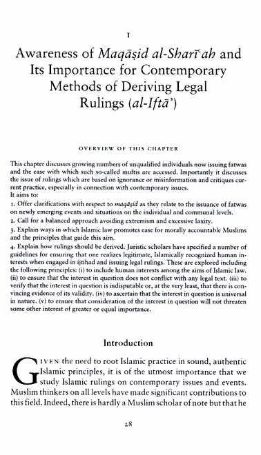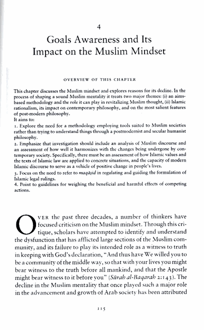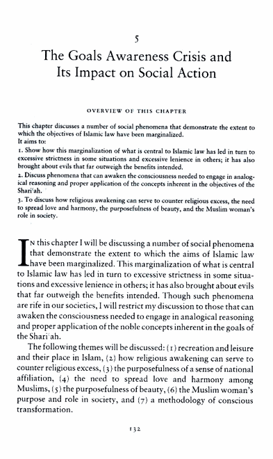 The author draws attention to the importance of understanding various levels of maqasid, including distinguishing between primary aims (al-maqasid al-asliyyah) and secondary aims (al-maqasid al-tabi'ah). Al-Qahtani asserts that a positive understanding of the objectives of the Shari'ah should produce affirming human and cultural developments in Muslim societies. The real strength of this work, however, is in the author's application of higher objectives and aims to different areas of jurisprudence, such as in deriving and issuing religious rulings (ifta'). and to important social issues and problems present in Muslim societies, such as extremism, jihad, commanding right and forbidding wrong, social change, crisis of Muslim thought, countering religious excessiveness, the need for recreation and leisure, citizenship and nation-belonging, spreading beauty and harmony in Islam, and the role of Muslim women in society.