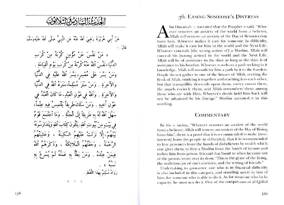 Imam an-Nawawi assembled his collection of forty-two ahadith together with the absolute minimum of fiqh and commentary necessary for people not to misunderstand their import. Ibn ’Uyaynah said, ”Ahadith are misleading except to those who have fiqh.” Ibn Wahb said, “Every man of hadith who has no Imam in fiqh is astray.” Of the huge number of collections of forty hadith, the one by Imam an-Nawawi is undoubtedly the most famous and most enduring. This is, to our Knowledge, that work’s first full translation into English and so we have called it “The complete Forty Hadith” of Imam an-Nawawi.