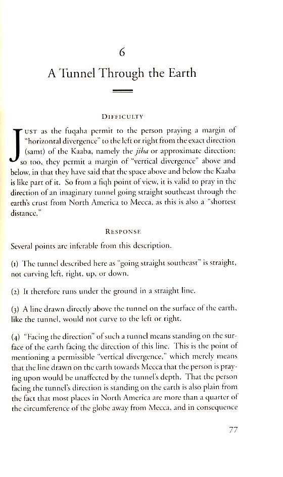From the back cover: “The Qibla is the noblest of directions. This book settles the question of the physical direction of Mecca from North America in the first thirty pages, after which it presents to readers for the first time the 1998 Fatwa of al-Azhar on the North American qibla. From this point of departure, the author surveys such major contemporary issues as the relation between religion and science, the Sacred and profane, scholars and engineers, ijtihad and taqlid. Combining traditional Islamic law, a clear exposition of the complex geographical issues, and the author’s own meetings and correspondence with twenty-three contemporary scholars from seven Muslim lands, the book is a journey of discovery not only for Western Muslims, but everyone interested in Sacred Law in a modern world.”