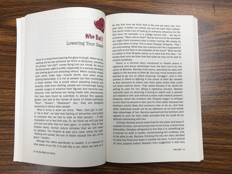 "The War Within Our Hearts", written by 2 young American Muslim activists and educators, speaks directly to teens in a direct, no-nonsense manner, backed up by a solid Islamic foundation and ethos. The purpose of writing it was to show Muslim youth in the West that they are not alone in the problems they are facing today. As integration and assimilation to society is increasing within the Muslim community, youth are battling a variety of enemies that may not have been faced by their parents. By recognizing that these problems are not unique to an individual but are common place for Muslim youth today, this book will address certain issues which may have otherwise been avoided.